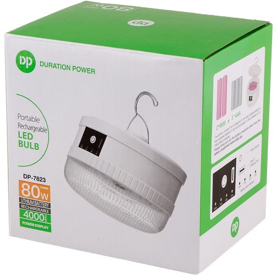 چراغ شارژی 80 وات دی پی مدل DP-7823 مناسب برای کمپینگ، کوهنوردی، مسافرت، طبیعتگردی و… مدل لامپ: LED شارژدهی در حالت نوردهی ضعیف حدود 12 ساعت، نوردهی متوسط 4.5 ساعت و نوردهی قوی حدود 3.5 ساعت